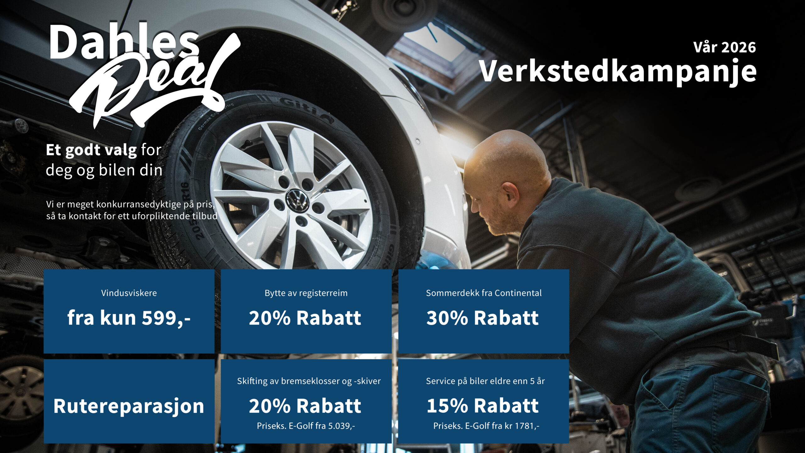 Har du en Volkswagen, Audi eller Skoda eldre enn 5 år, får du med Dahles Deal ekstra konkuransedyktige priser. Dette sikrer at bilen din holder den samme høye kvaliteten lengre og at du får gjort en god deal året rundt. Vi gir deg servicetjenester med trygghet og kunnskap inkludert! Vi KAN bilen din. Hos oss blir bilen din tatt vare på av en spesialist og ikke en generalist.